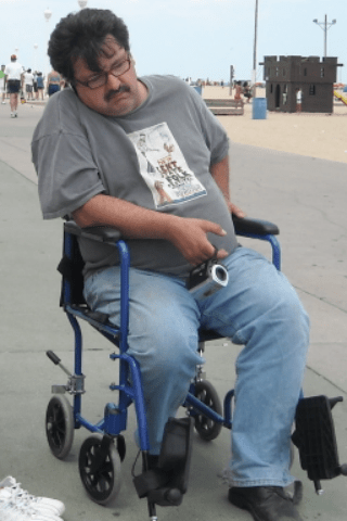 I fell asleep in my mom’s wheelchair and my brother took a picture of me. I didn’t know about it at the time and months later he had the picture enlarged and framed. It is without a doubt the worst picture of me ever taken (including the Halloween picture of me as Boy George).